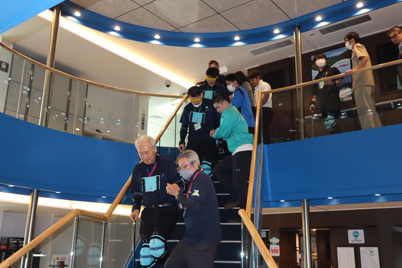 まず、高齢者疑似体験学習では、体験用キットを装着し、フェリー「クイーンコーラルクロス」船内での移動などを通じて、加齢による身体機能の低下が移動に及ぼす影響や身体的負担について学習しました。